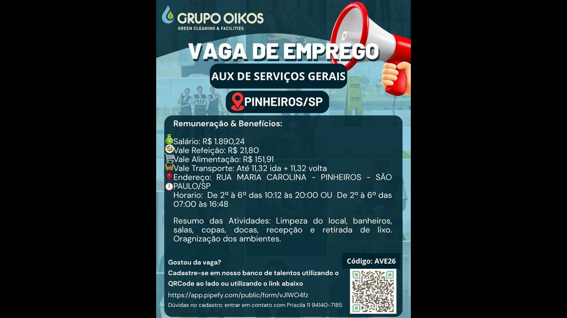 Olá, somos o Grupo Oikos, uma empresa especializada na terceirização de serviços de facilities, e adoraríamos te ter conosco!